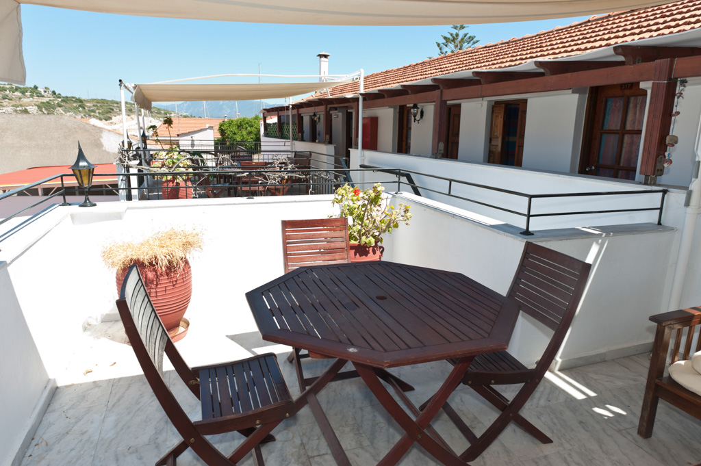 Από την μπροστινή πλευρά και με θέα το Πυθαγόρειο διαθέτει ιδιωτική βεράντα με σαλονάκι για να απολαύσετε το ποτό σας.